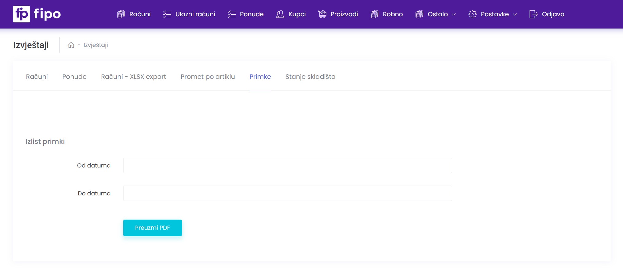 Otvaranjem stavke u izborniku Ostalo > Izvještaji i klikom na tab Primke otvara nam se sekcija za generiranje izvještaja Liste primke u određenom periodu.