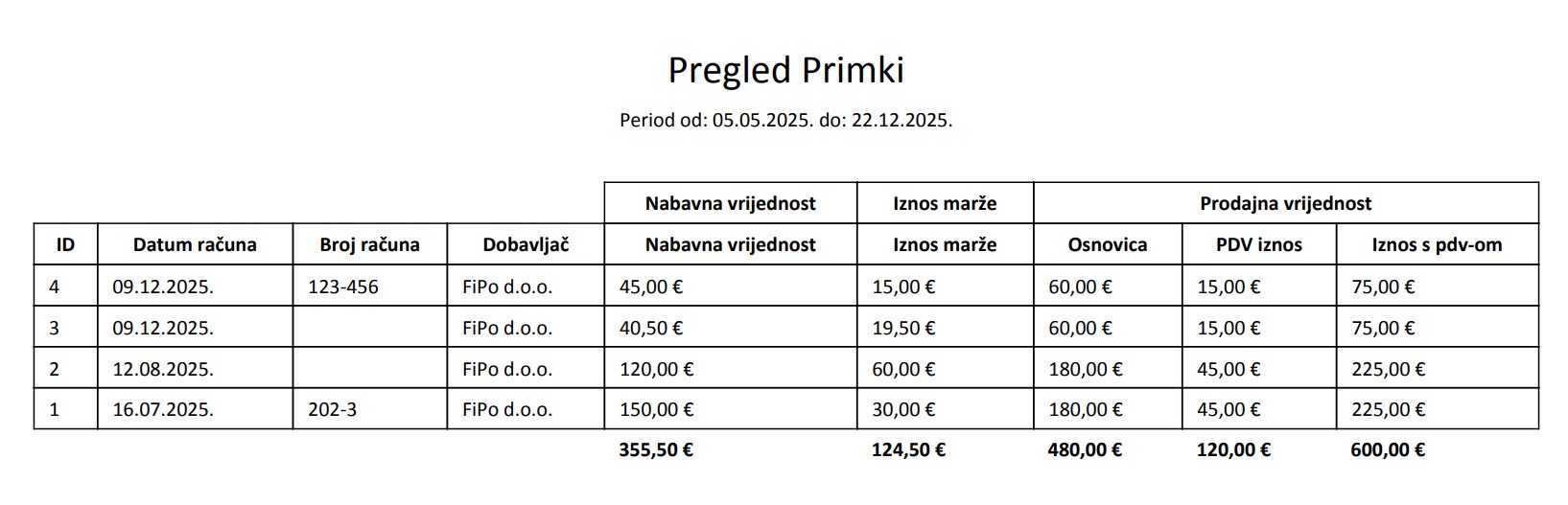 U dokumentu je vidljiva nabavna vrijednost ulaznog računa, iznos Vaše marže, osnovica, PDV iznos i iznos s PDV-om.