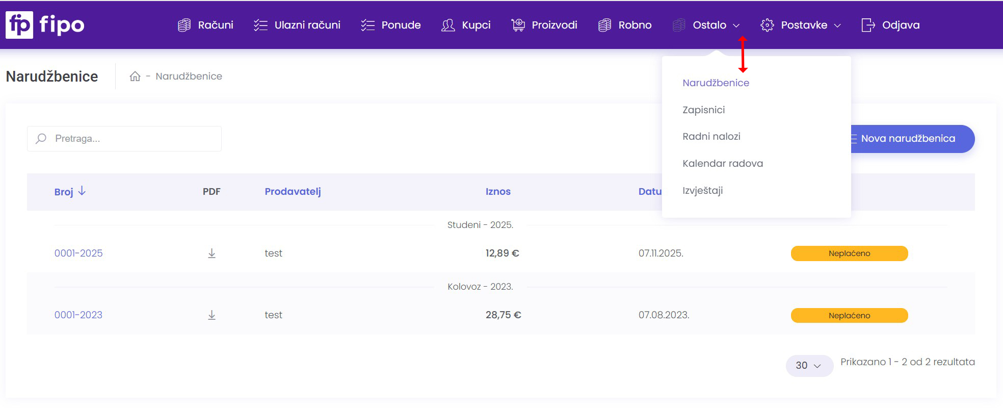 Klikom na stavku Ostalo > Narudžbenice u izborniku pruža se mogućnost izrade Narudžbenice: