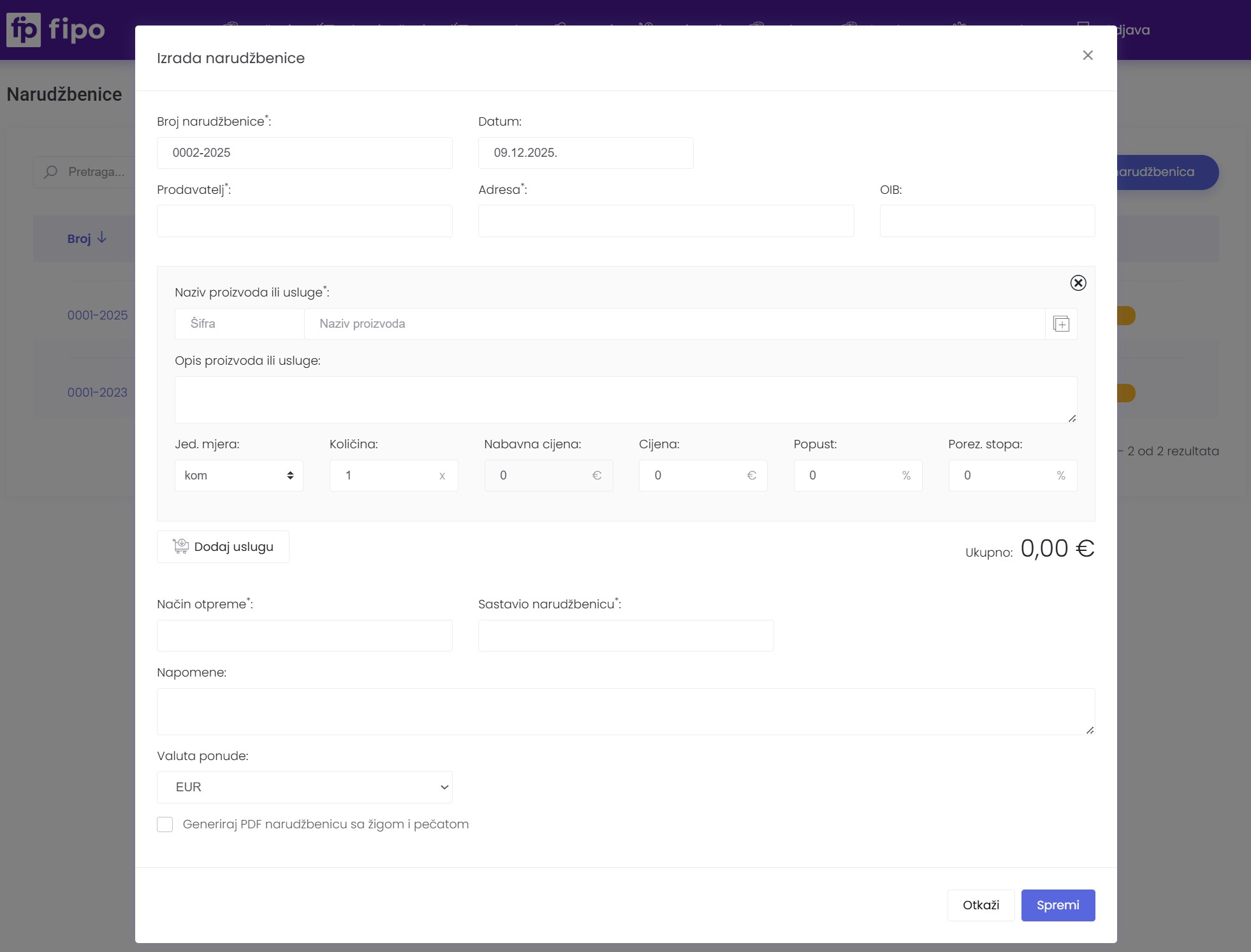 Klikom na gumb Nova narudžbenica koji se nalazi u gornjem desnom dijelu otvara se editor za unos podataka: