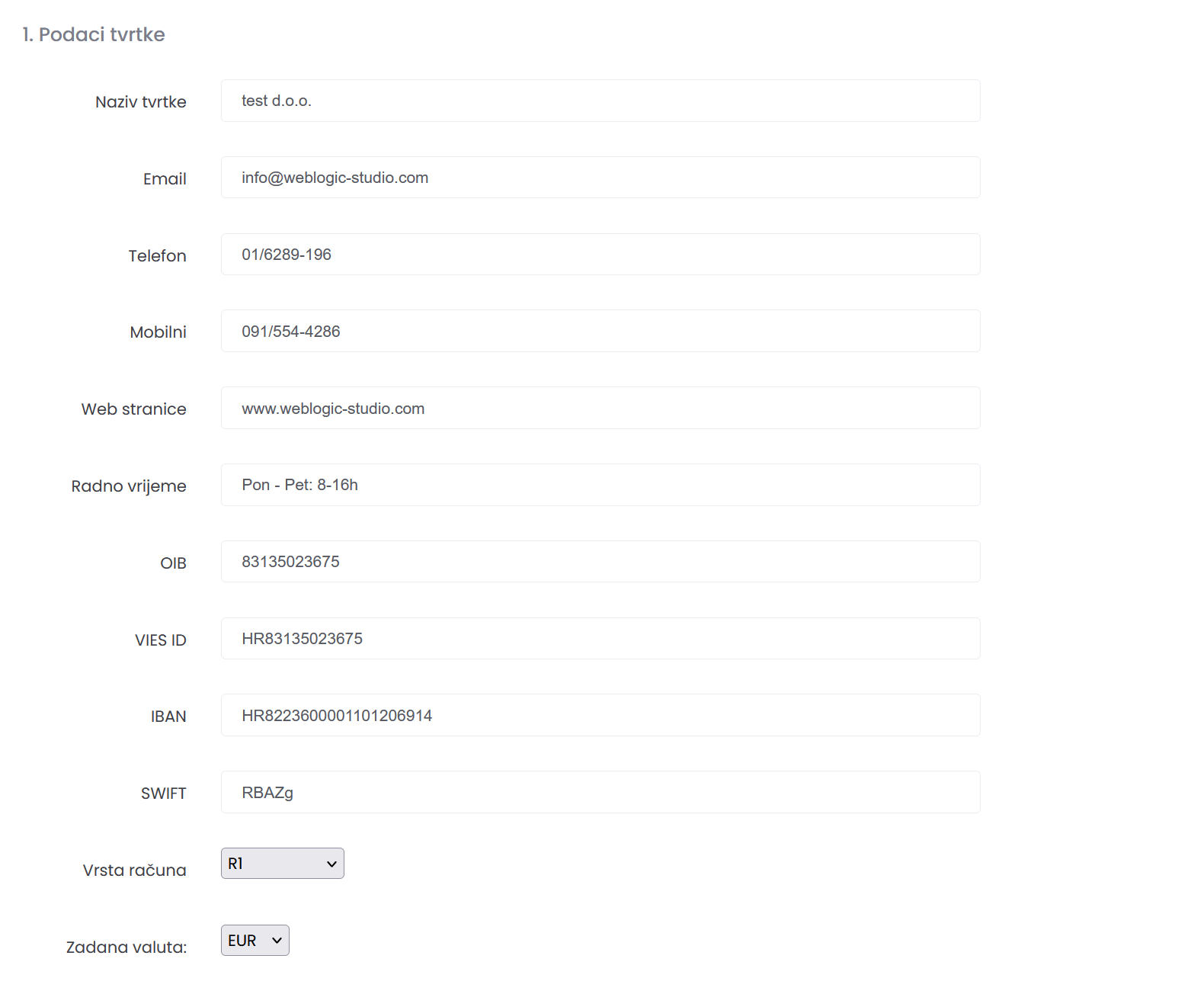 Sekcija podaci o poduzeću su glavne postavke Vašeg programa i one definiraju informacije i izgled Vaših računa, ponuda i ostalih dokumenata.