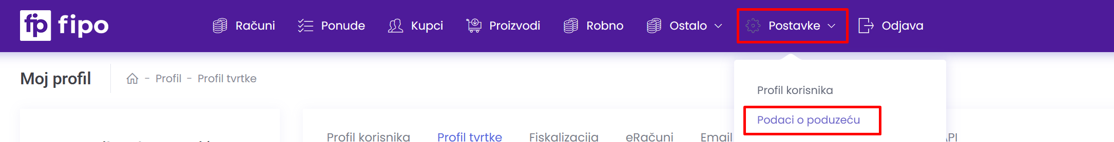 Pristupu se vrši putem Postavke > Podaci o poduzeću