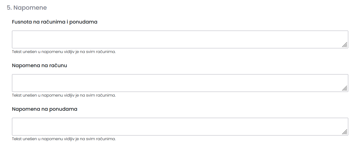 Kao što i sami naslov kaže, ovdje se unose napomene koje će biti vidljive na Računima, ponudama i fusnota koja je vidljiva na svim dokumentima