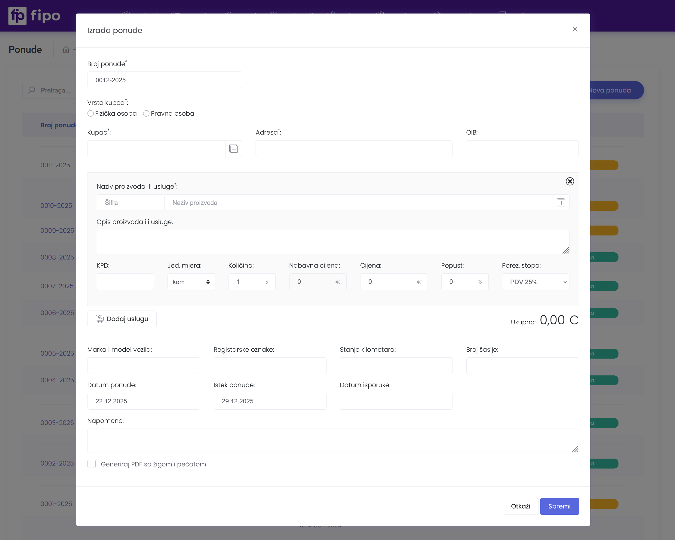 - Broj ponude – generira se automatski
