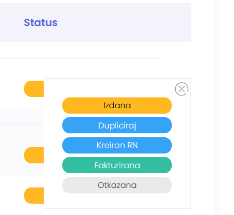 - Kreiran RN – status koji će Vam kreirati novi radni nalog iz ove ponude (korisno kada imate redoslijed rada: ponuda > radni nalog > račun)