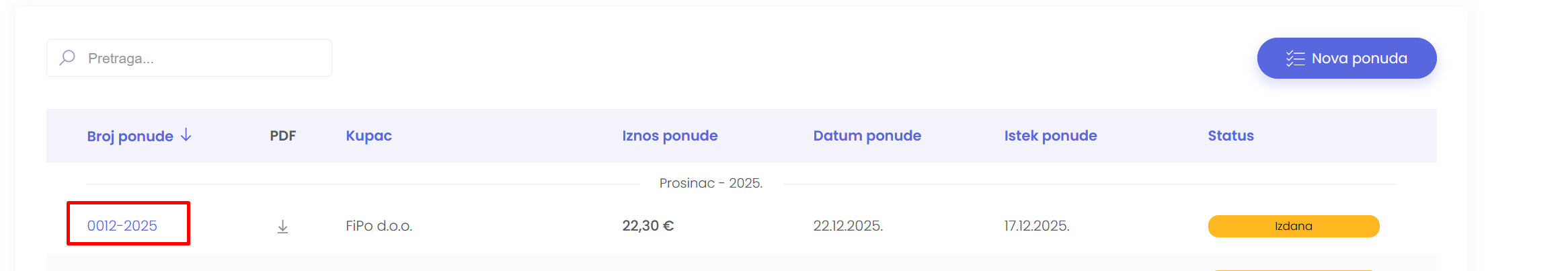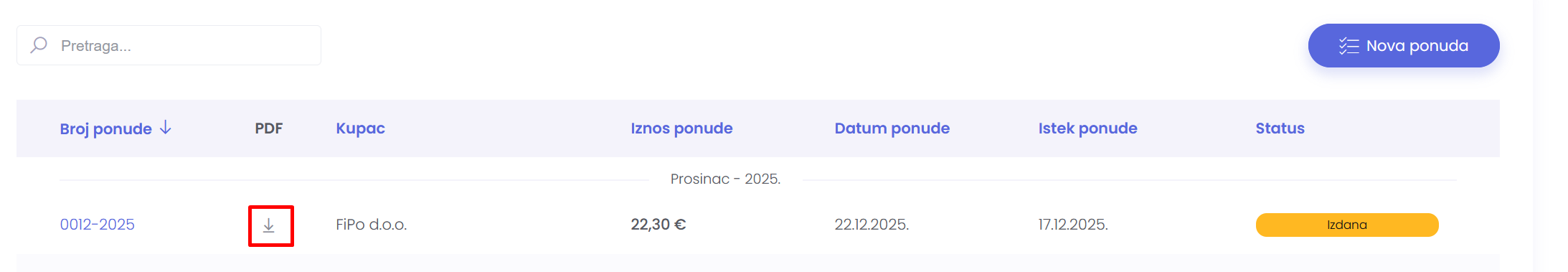Preuzimanje ponude vrši se klikom na download ikonu u stupcu PDF.