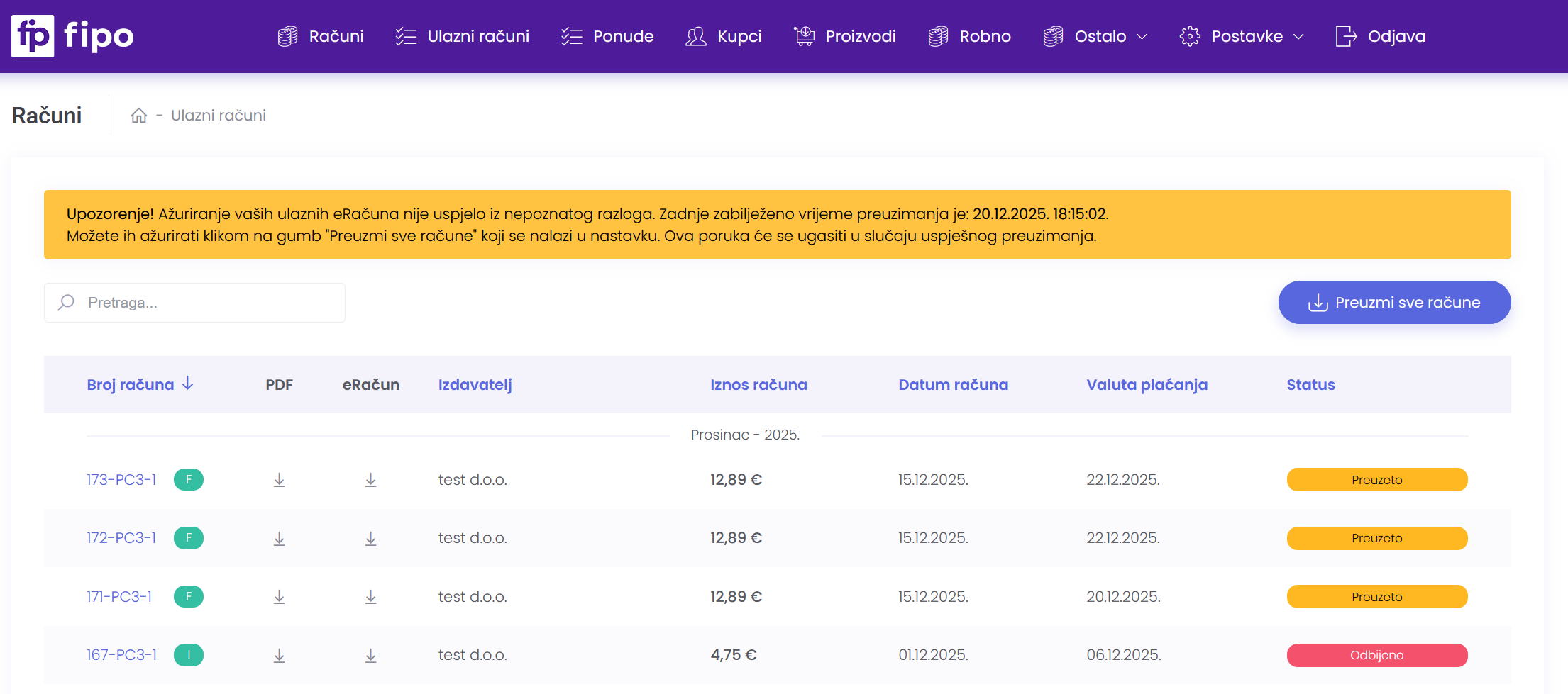 Klikom na sekciju “ulazni računi” otvara se ekran sa prikazom svih pristiglih eRačuna. eRačuni se automatski dohvaćaju, ali u slučaju da se automatsko dohvaćanje iz nekog razloga ne izvrši klikom na “preuzmi sve račune” inicirate ručno ažuriranje stanja.